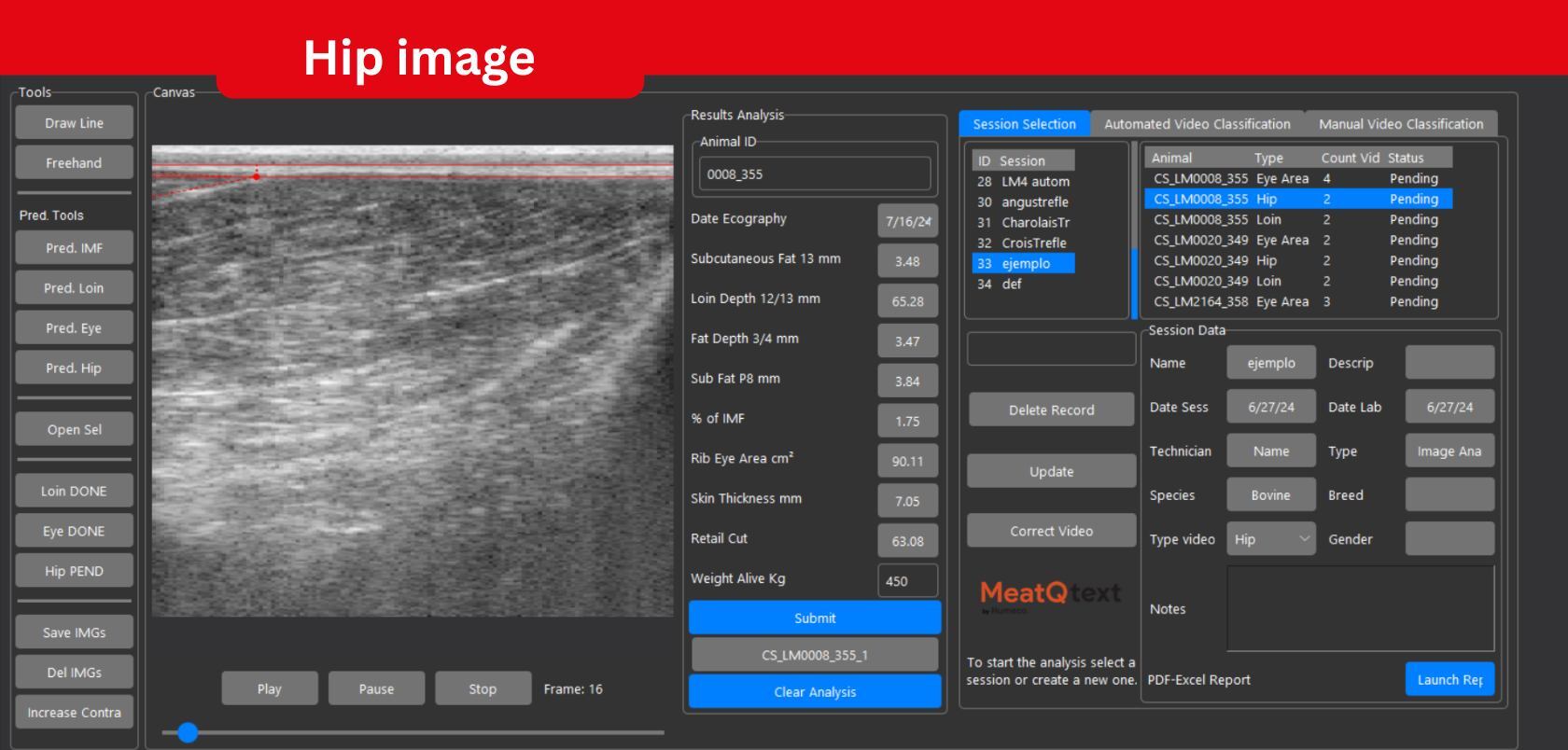 The MeatQtext software allows for the objective measurement of loin fat infiltration, subcutaneous fat, ribeye area, and muscle depth. All of these measurements are taken in the live animal, making it possible to apply them in genetic selection or in feedlot management.